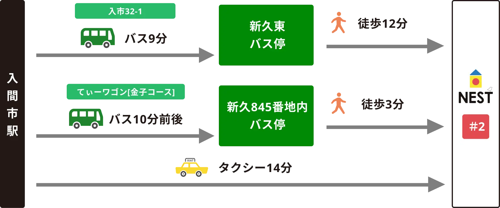 1. 「新久東バス停(9分)」下車、そこから徒歩12分